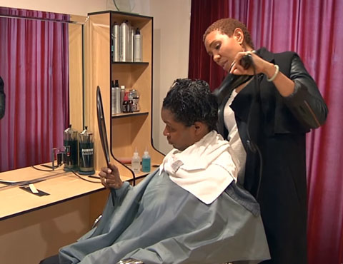 Don’t be afraid to ask your hairstylist for a mirror! Carmita gets an intro to the blow dry technique used to create her salon-styled look. She watches, listens and learns about brushes, heat, tension and more.